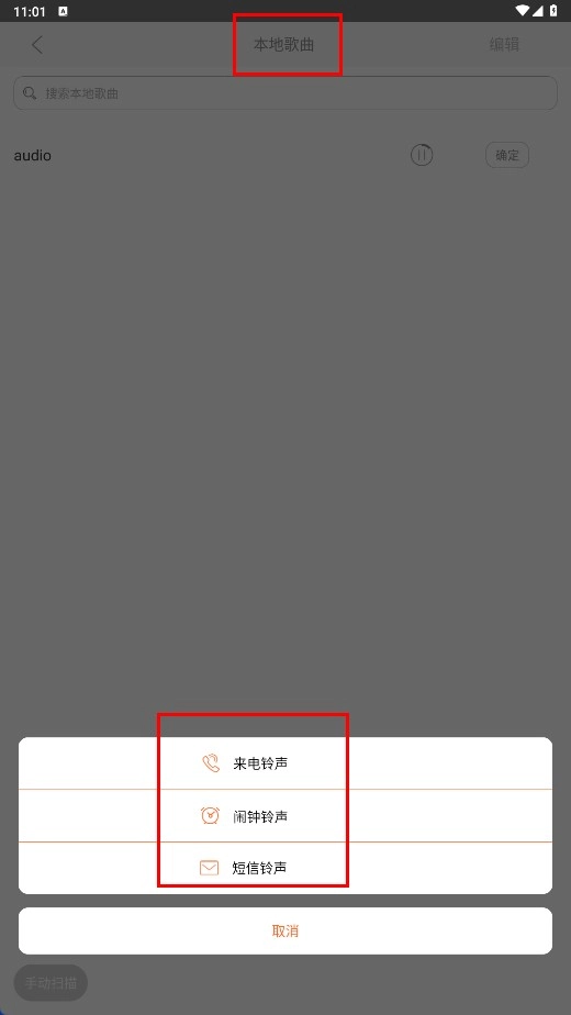 在本地歌曲页面,你可以选择把本地歌曲设置成【来电铃声】【闹钟铃声】或者【短信铃声】。