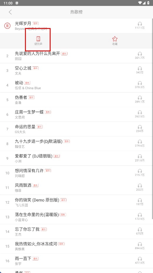 在热歌榜页面,点击歌曲旁边的【设铃声】功能按钮,就能设置铃声。