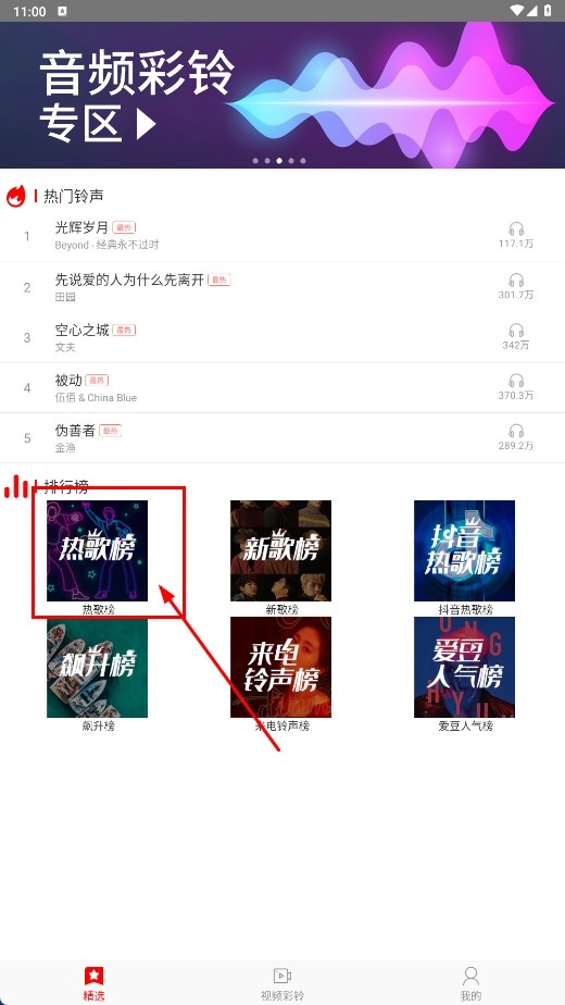 在精选页面的排行榜区域,点击【热歌榜对应的榜单图标】,即可进入热歌榜页面。