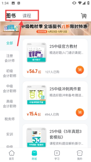 切换到商城界面,可以在此购买图书或者课程