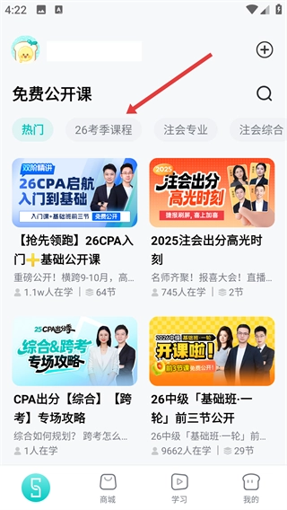 打开斯尔教育后,找到免费公开课板块,点击其中的【26考季课程】,就能切换到对应考季的课程列表啦。