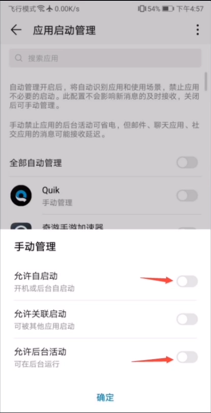系统设置-应用-应用启动管理-向GI授予权限-允许自启动-后台活动