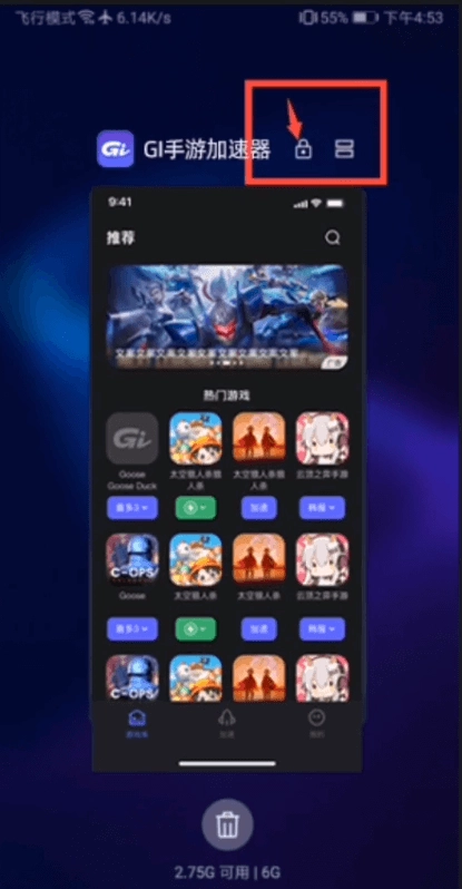打开GI加速器后,找到并打开其后台程序;接着点击GI加速器的图标,将其向下拉动,完成后台锁定操作。