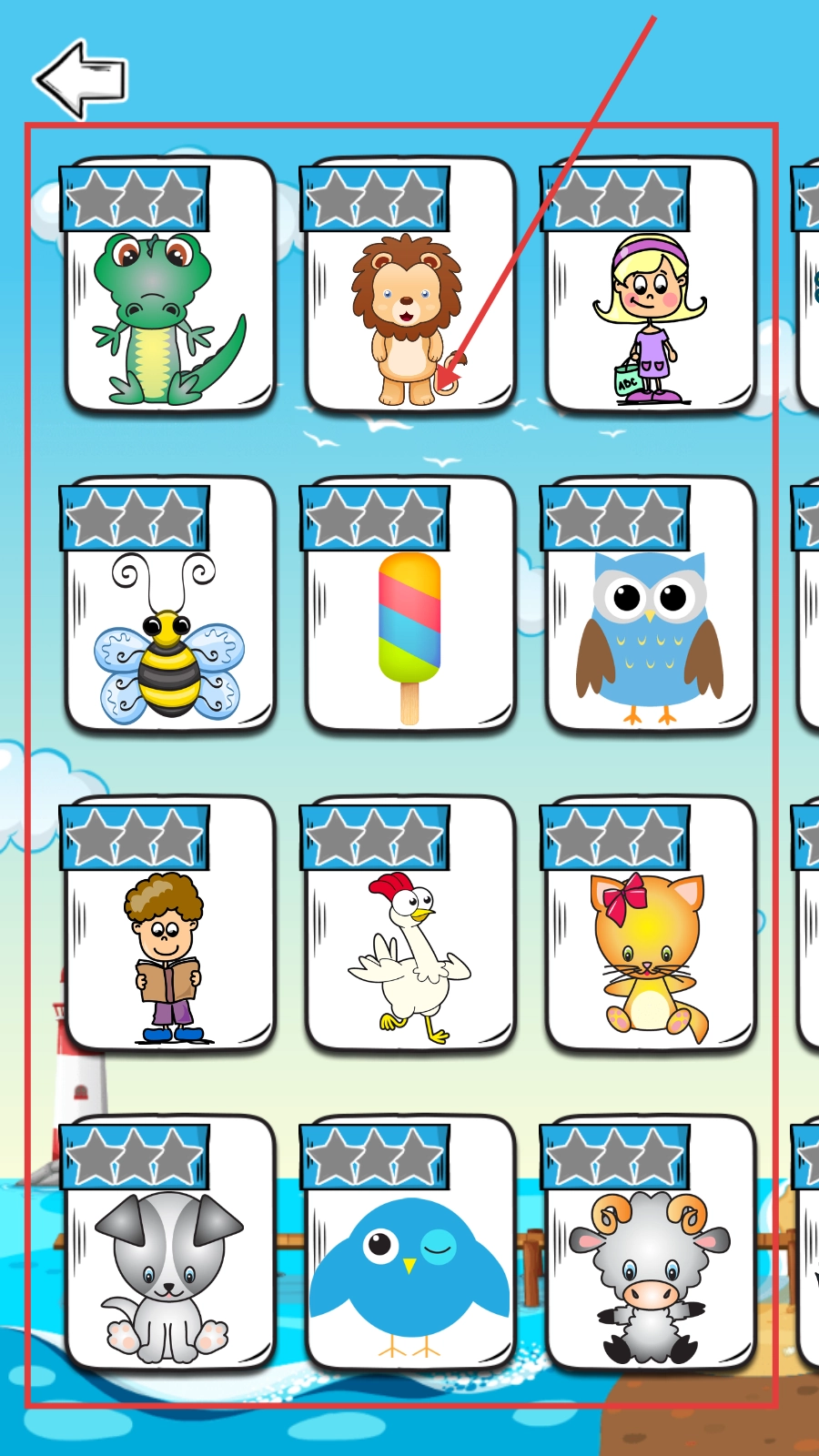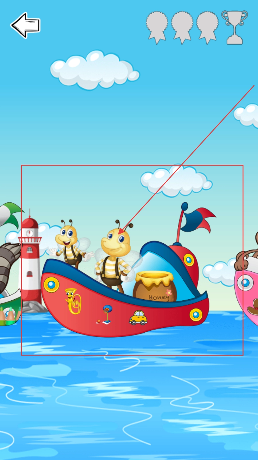 打开儿童教育类应用,进入主界面后,映入眼帘的是各式各样的卡通图案,接着挑选像蜜蜂乘船这类自己感兴趣的场景图案。