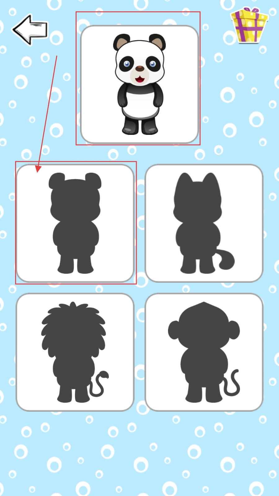 点击你感兴趣的动物图标,就能进入该动物的学习页面。页面上方会展示动物的形象,下方则设有相关的互动选项。你可以通过观察动物的特征,把它和对应的影子匹配起来就可以了。