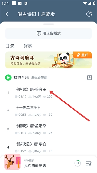 之后我们点击《咏鹅》这类具体的诗词,就能播放相关内容了,这样孩子学起古诗来会更轻松哦。