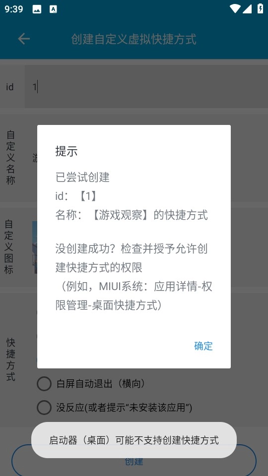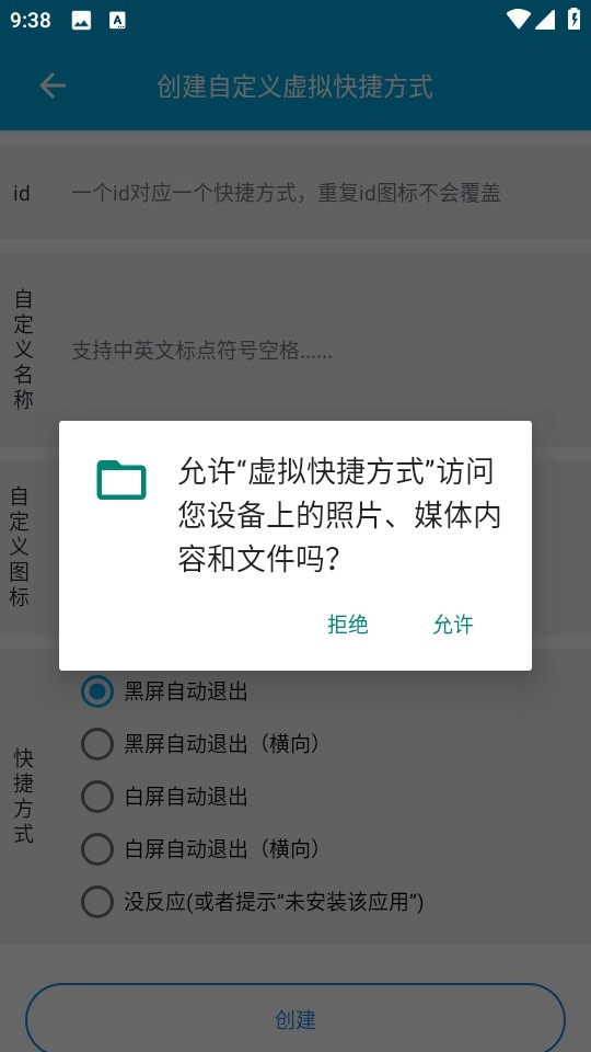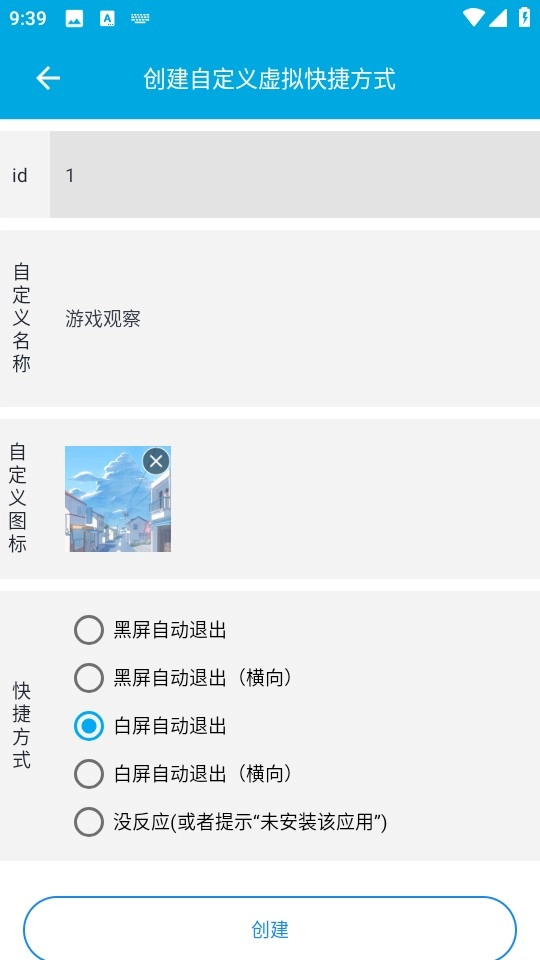 3、再接着自定义输入id,名称,图标,以及选择一个快捷方式之后,点击【创建】。