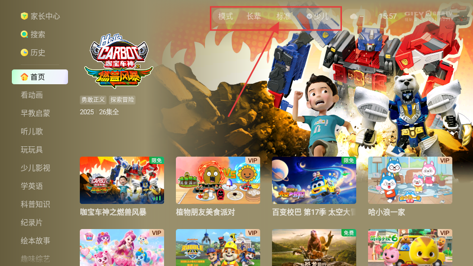 进入少儿模式后,页面顶部设有模式切换的选项,若需切换模式,点击相应的模式按钮即可完成操作。