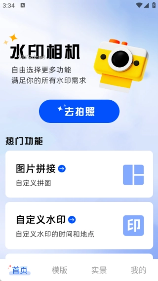1、首页设有去拍照功能,此外还具备图片拼接、自定义水印以及图片编辑等热门功能。