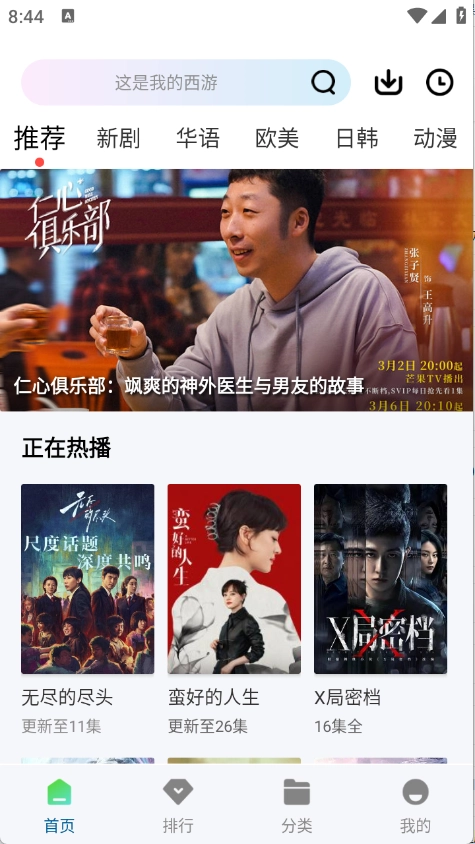 进入首页后,顶部栏陈列着丰富的影视资源,涵盖电视剧、电影和综艺等类别。