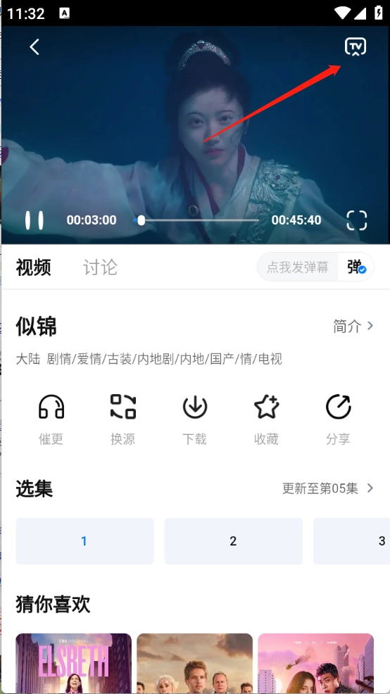 用户在选择好想要投屏的影视资源后进入播放界面,接着点击页面右上角的“TV”按钮。