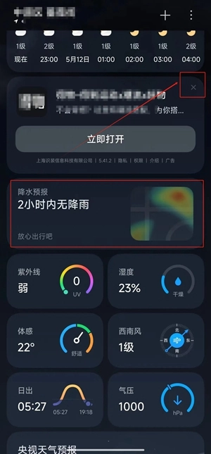 4、实时天气预报,可以预测未来2小时之内的降雨情况,对于界面的广告而言,点击右上角的叉号即可。