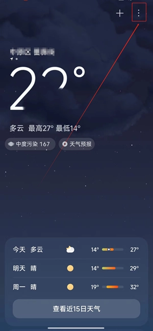 1、开启方法很简单。打开桌面的天气App,点击右上角的三个点。