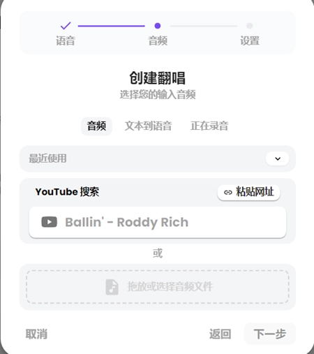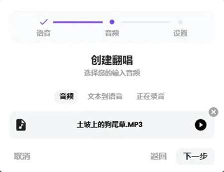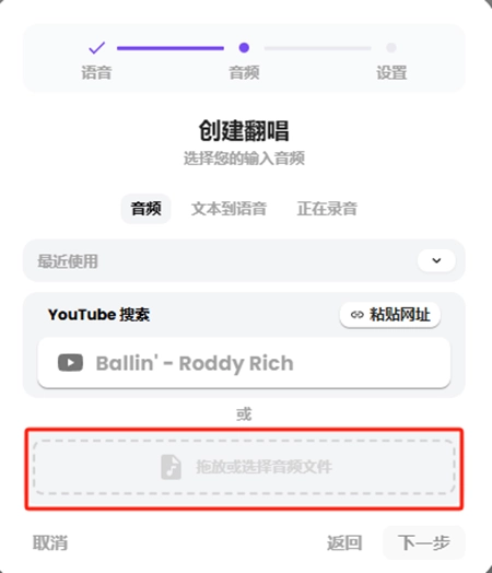 4、它不仅支持歌声翻唱,还可以输入文本转语音,或者直接用麦克风输入语音翻唱,上传音频后,点下一步。