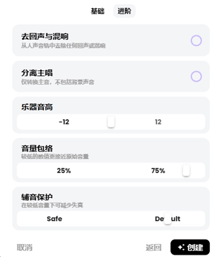 6、进阶的选项可以做一些更细致的调整,建议先用默认,如果生成的效果不满意,再进行微调。点击右下角的创建。