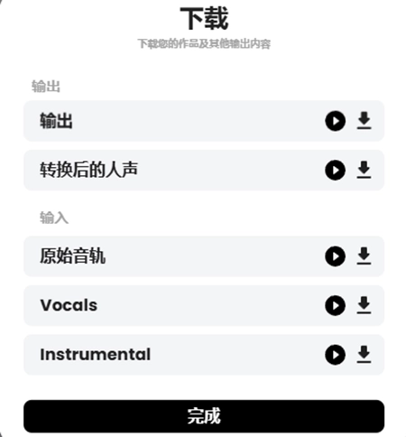 9、界面中的音频,按顺序分别为:翻唱后的人声与伴奏(若存在)、翻唱后的干声、原始音频、原始音频中的干声、原始音频中的伴奏。