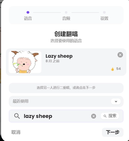 2、此时会弹出一个对话框,在其中输入你所选择的音色名称,比如:Lazy sheep 。由于这是国外的平台,其内部的模型大多采用英文命名,因此我们需用英文进行搜索,完成输入后点击下一步。