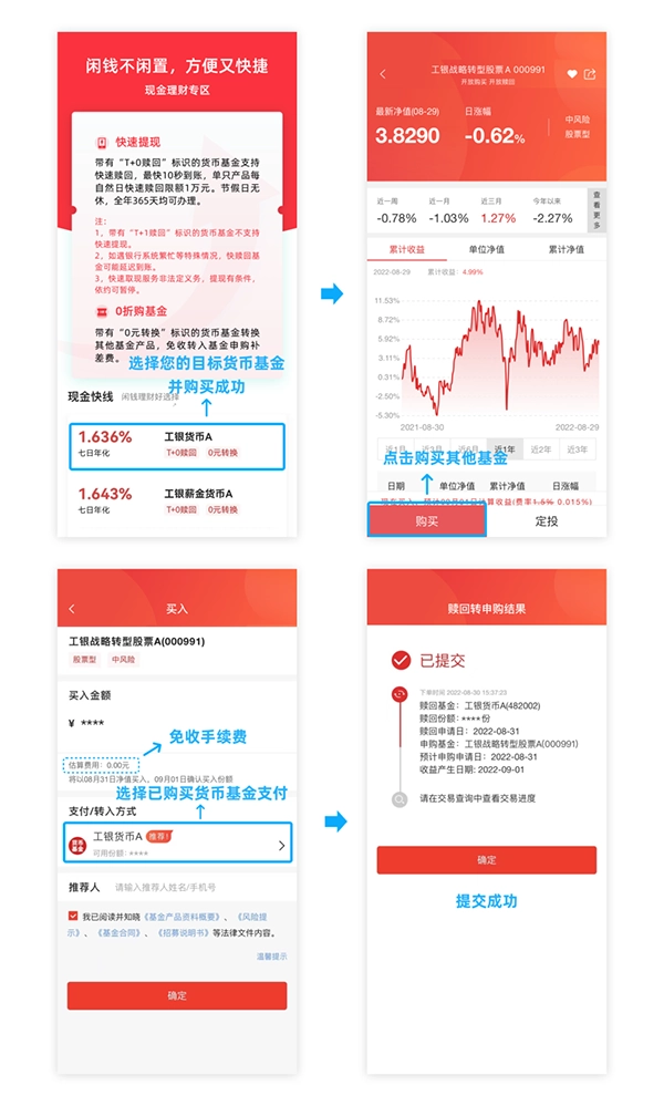 在完成购买操作时,您可以选用已持有的工银货币A(482002)这款货币基金进行支付,整个过程不会产生任何手续费用。