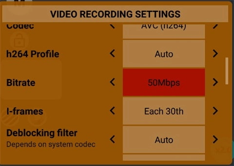 向下滑动屏幕,我们就进入了编码器设置界面。这里需要调整的是码率和码率模式,对应的就是图中俄文标注及其下方的选项。码率是造成画面分辨率高却不够清晰的关键因素之一——手机厂商通常会为了节省内存,对视频码率做一定限制;但借助这款软件,我们可以手动调节当前码率。我个人建议:1080p 60fps的视频,码率设为75左右比较合适;4K视频的话,码率控制在200左右即可。 至于码率模式,推荐选择“可变”。原因在于,视频中并非所有画面信息都有保留的必要,很多重复画面在存储时会被自动填充,以此减少空间占用。选择可变码率模式,能更好地提升存储利用效率,过滤掉不必要的冗余画面。