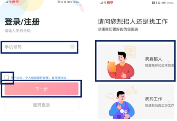 注册时,先输入手机号码,接着勾选用户协议,再点击“下一步”;而用工企业则选择“我要招人”选项。