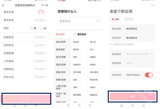 初次注册并登录后,你可以先创建自己的招聘名片,把相关信息填写完整,然后点击“下一步”;接着选择你要招聘的职位类型和具体职位名称,选好之后再填写职位要求和薪资范围,最后点击“完成”就可以了。