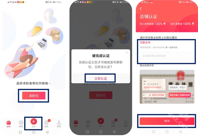 当需要添加招工信息时,要点击“+发布”按钮,接着点击“发职位”选项,此时系统会提示你需先完成认证,你可以直接点击“立即认证”按钮进入认证页面。