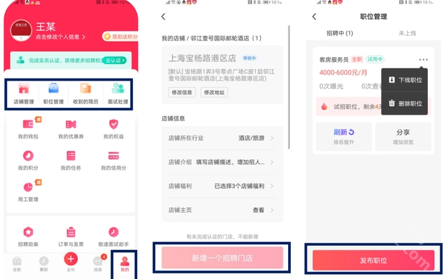 点击“我的”进入个人界面后,就能开展“店铺管理”“职位管理”操作,还能查看“收到的简历”以及“面试处理”的相关信息。