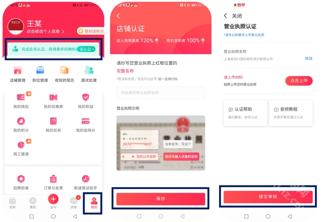 另一种认证途径是先点击“我的”,再点击“去认证”,输入营业执照的统一信用代码后点击“保存”;接着上传营业执照照片,最后点击“提交审核”即可。