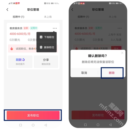 招工完成后,您可以在“我的”页面找到“职位管理”选项并点击进入。进入职位管理界面后,点击右上角的“…”按钮,然后根据需要选择“下线职位”或“删除职位”操作即可。