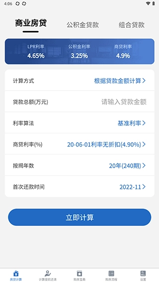 启动应用程序进入主界面后,用户可以在商业贷款、公积金贷款和组合贷款这三种贷款类型中进行选择。