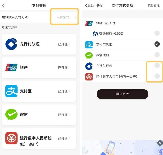 服务开通成功后,您可以进入地铁支付设置界面,将默认支付渠道调整为龙行付钱包或建行数字人民币钱包,确认选择后提交即可完成更改。