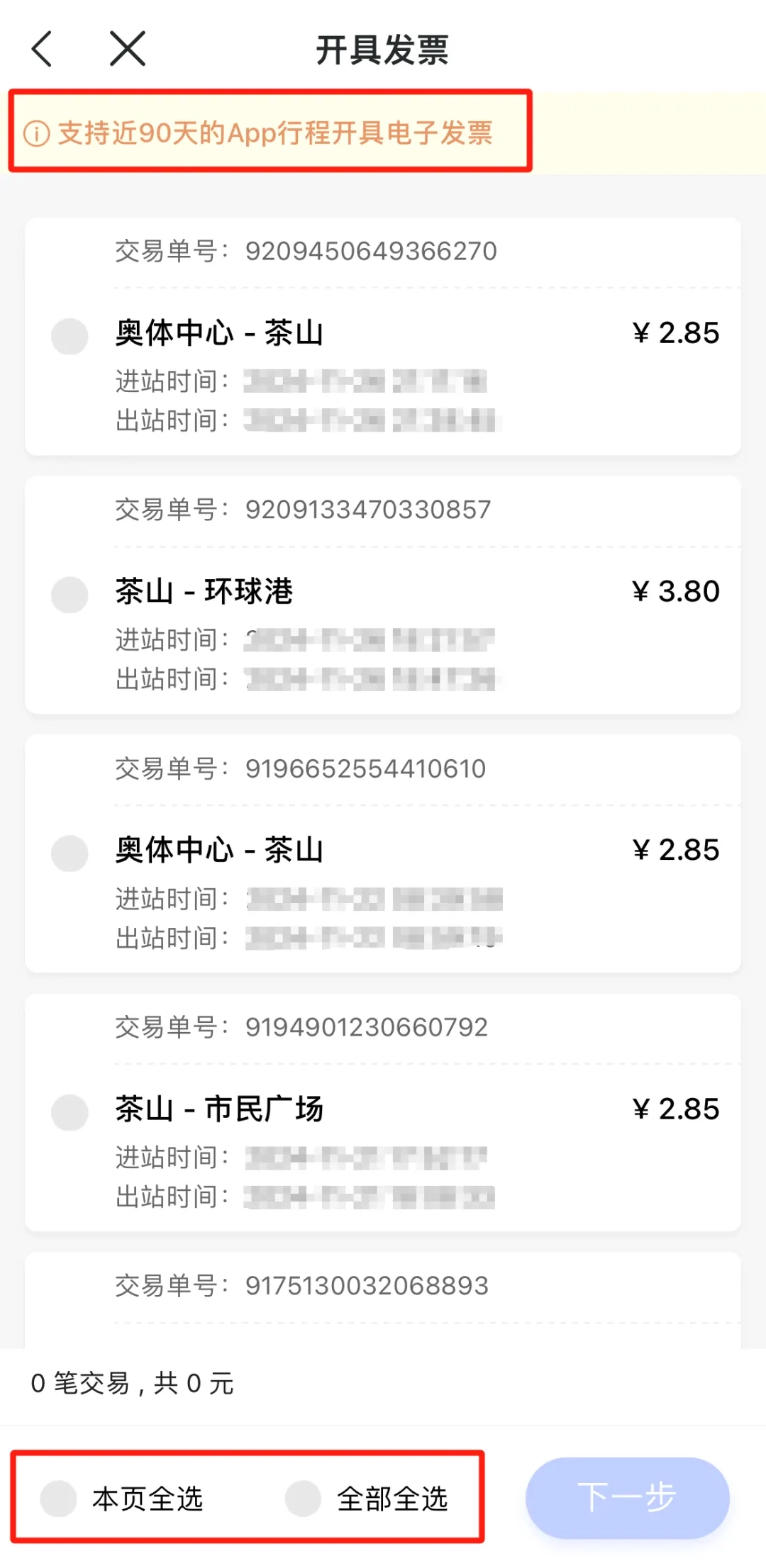 你可以在应用内选择需要开发票的出行记录,支持同时选多条,也能通过页面左下角的功能一键批量操作。要注意的是,这里只能为最近90天内的行程开具电子发票。