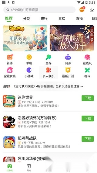 1、首先在手机上打开4399游戏盒,如下图所示,包含了新游、单机、生存、冒险、网游、在线玩等多种题材;