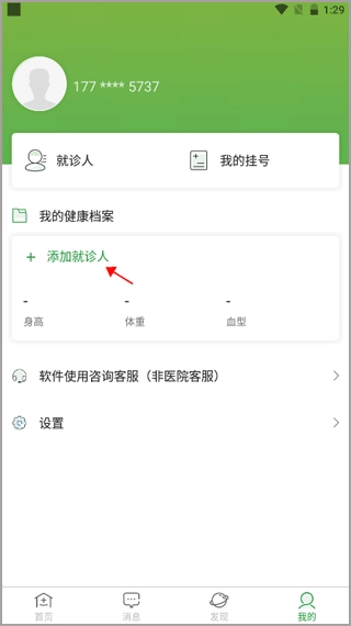 打开登录软件账号后,切换至“我的”功能模块,再从“我的健康档案”中选择添加就诊人的选项。
