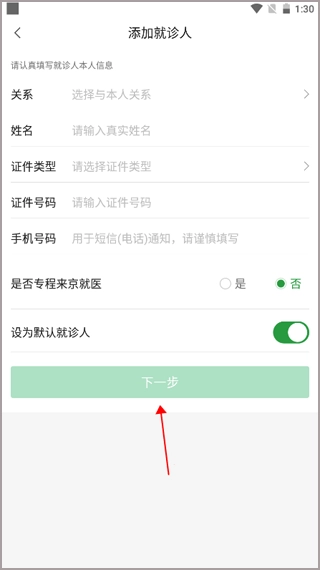请填写就诊人的个人信息,如姓名、身份证号等,点击“下一步”即可完成添加。