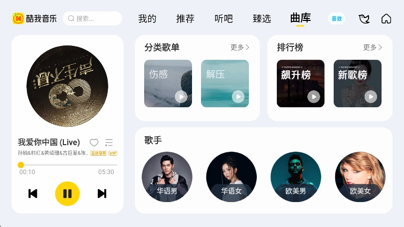 酷我音乐车机版是一款专门针对行车场景打造的音乐播放应用。此版本已完成永久会员的修改优化,用户只需登录个人账号,即可在软件中畅享各类会员专属服务,并且所有功能均完全免费,大家可以安心体验。此外,它适配的车型十分丰富,有需要的朋友不妨尽快尝试使用!
