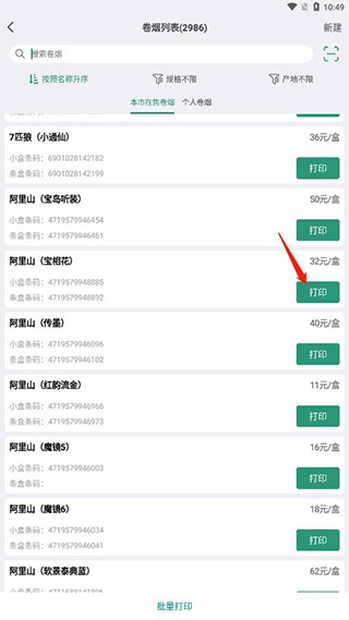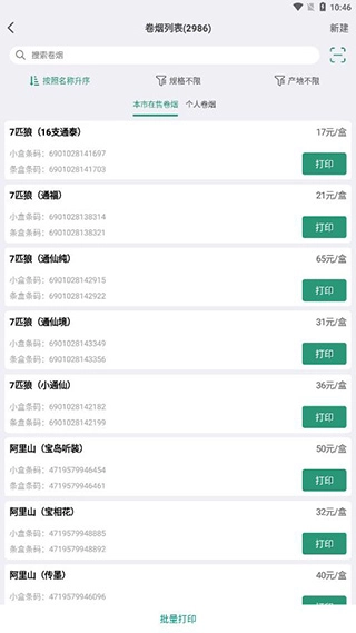 烟草价签管理是一款专业的烟草价格打印软件,为商家提供专业的商品管理与价签打印解决方案,带来方便、快捷、省时省力的服务体验。考虑到部分商家可能对烟草价格信息掌握不全,软件特别设置了卷烟列表功能,其中涵盖2986种卷烟的详细信息,包括价格、条码、盒数、规格、产地、焦油量及全市统一零售价,商家可随时查看。此外,借助卷烟搜索功能,输入卷烟名称即可快速获取对应产品的价格信息。