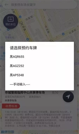 按照实际需要查找并确定合适的共享停车场后,点击界面左上角的“预约车位”按钮(若尚未注册则需先完成注册操作)。