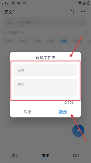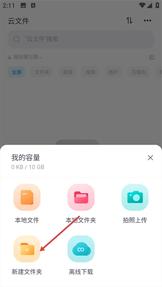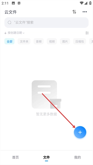 在云文件页面,点击右下角蓝色的“+”按钮,即可打开功能操作菜单。