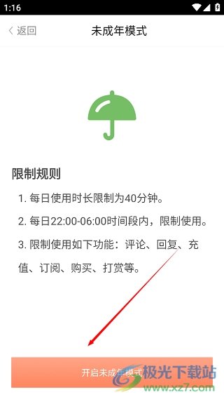 然后在弹出的新窗口里,可以看到关于未成年模式的说明,点击下方的“开启未成年模式”按钮。