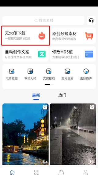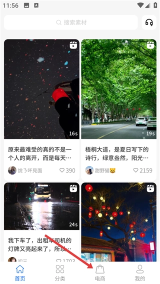 抖素材,打开软件后,点击底部的【电商】选项,就能进入素材电商板块,在这里可以浏览各种各样的素材。