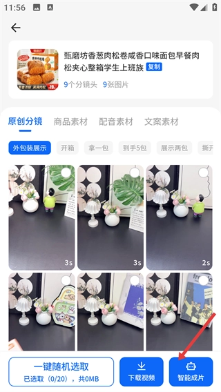 在商品素材界面点击【智能成片】,就能快速生成商品视频,让内容制作变得更高效。