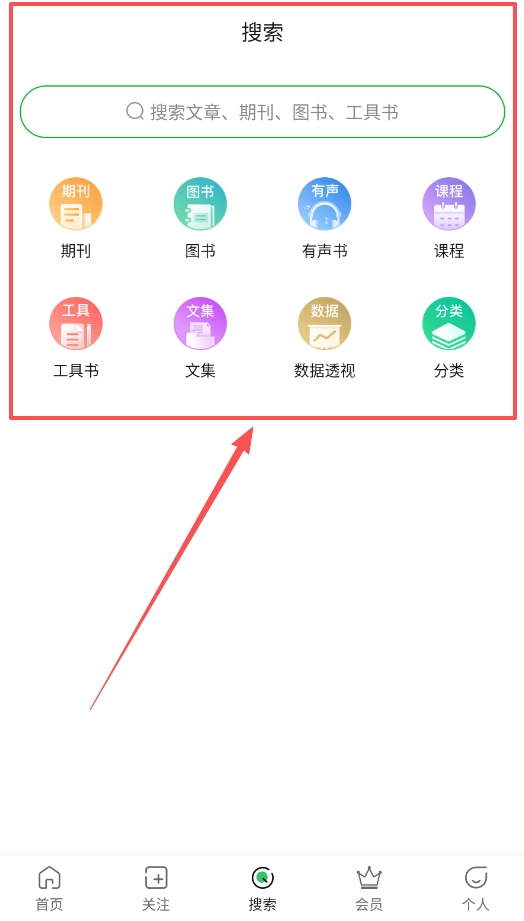 搜索功能十分实用,在首页点击搜索框,输入关键词即可查找文章、期刊或图书,还能筛选出期刊、有声书、课程等不同类型的内容。