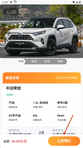 进入车辆详情页面后,选择具体的车辆信息,接着点击立即预订。
