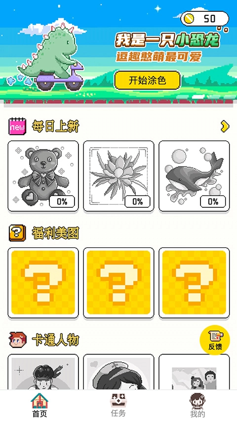 在首页界面,滑动屏幕就能看到【每日上新】、【福利美图】、【卡通人物】、【萌宠动物】、【装饰小物】和【美食美味】这些分类,玩家可以挑选自己喜欢的来填充内容。