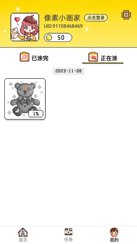 进入“我的”界面后,你就能看到目前已经完成涂色的作品,以及正在进行中的涂色作品。以上就是像素小画家最新版本的玩法介绍啦。