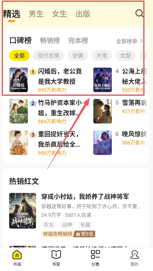 登录后,探索书籍的主要入口是“书城”和“分类”,在“书城”里你能浏览系统推荐的各类榜单,知晓当下最热门的小说。