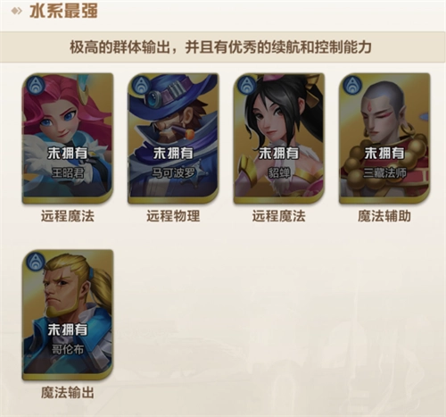 水系阵营堪称最强梯队,成员包括王昭君、马可波罗、貂蝉、三藏法师与哥伦布。该阵营具备极高的群体输出能力,同时拥有出色的续航与控制表现。