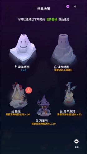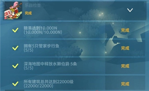 我们还能通过给鱼儿拍照,完成目标、签到以及每日任务来获取对应的奖励。要是不清楚该做什么,也可以点击右上角的奖杯图标去完成任务,这样成长速度会更快。之后按照指引就能实现扩张,开采新地形,得到宽岩石和海胆,其中还包括篱笆套景。点击神秘箱的话,会开出【海星】、一些生命额,还有可能获得贝壳的饰装。