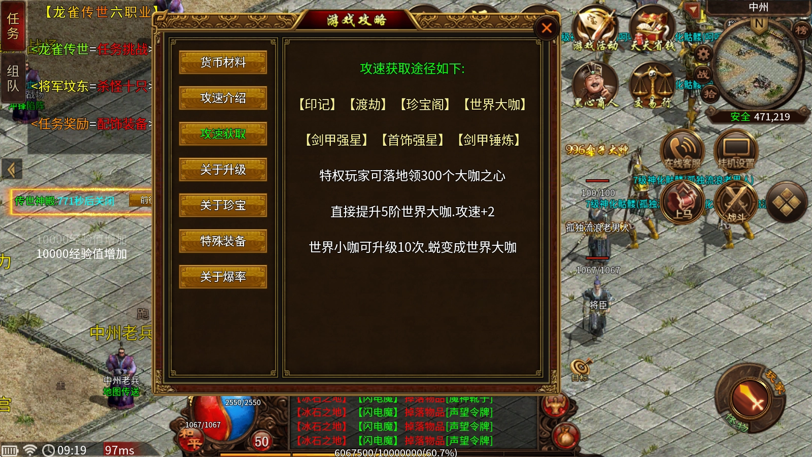 角色上线后每秒自动获取10000经验值,参与小试牛刀玩法每秒自动获取50000经验值,拥有终身特权的玩家每秒自动获取100000经验值。